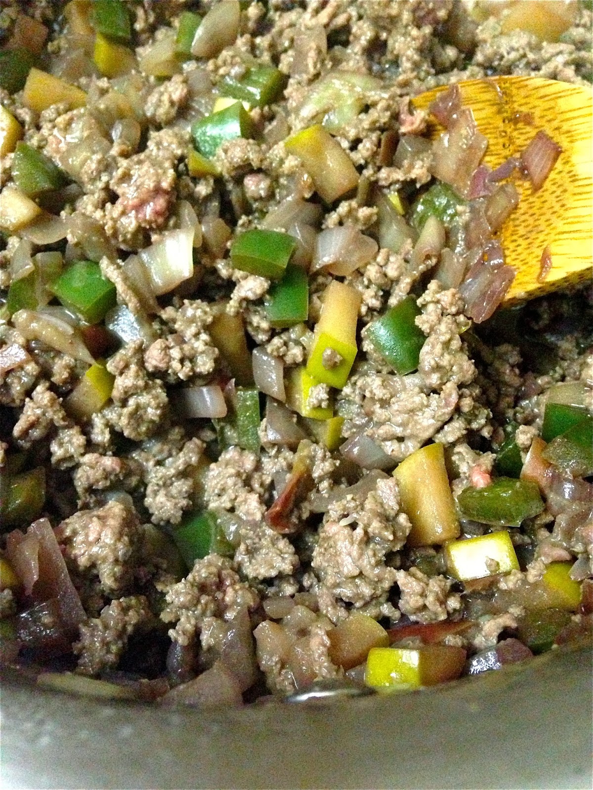 4. Add the hamburger meat and cook until no longer pink. Season again with salt and pepper.