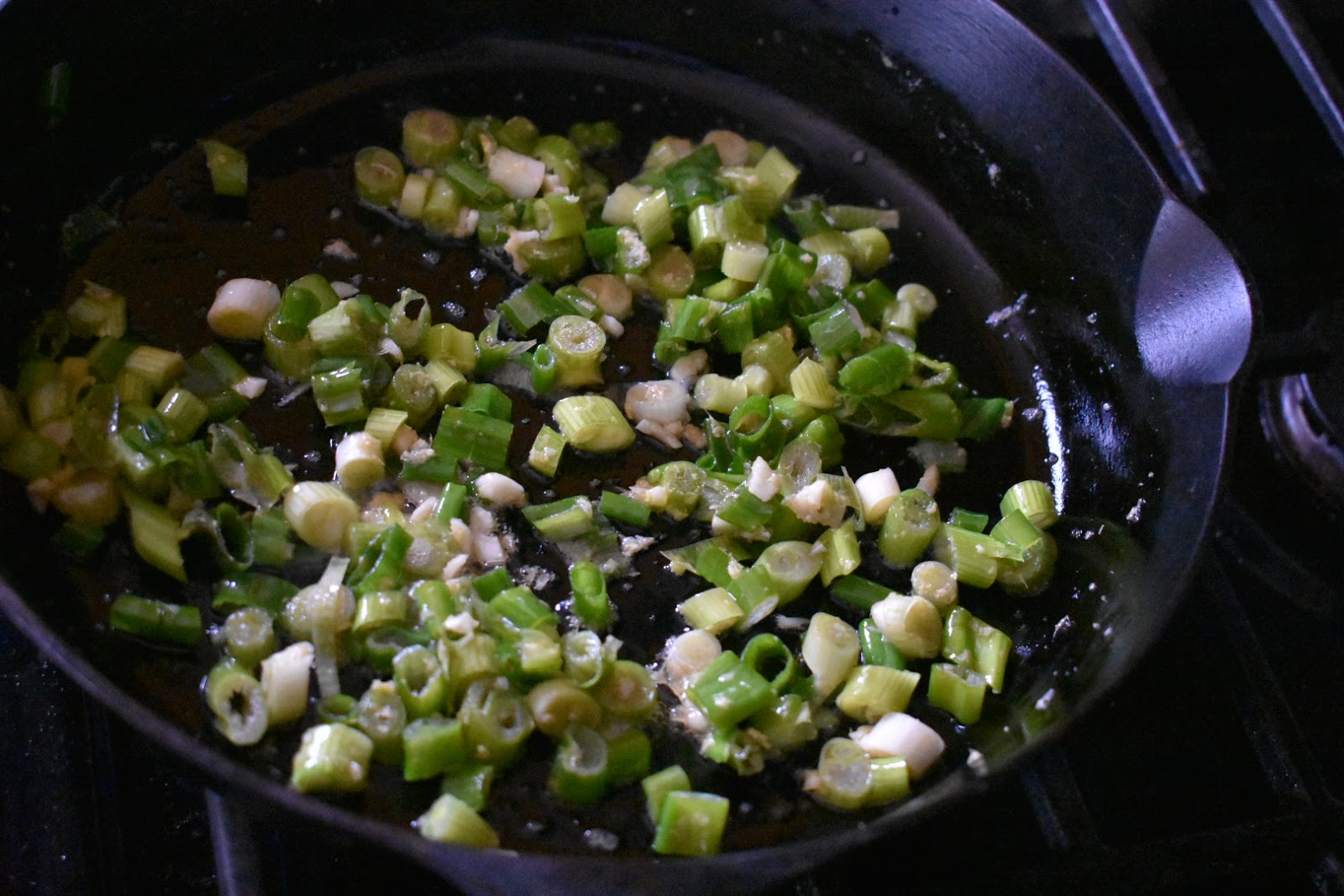 2. Heat the sesame oil in a large non-stick skillet over medium heat. Add the garlic, ginger and green onion and cook for 2 minutes. Remove pan from heat and allow to cool slightly.
