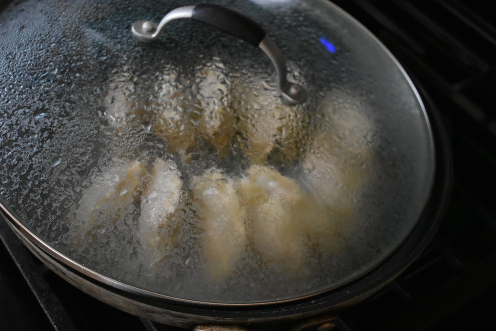 5. Heat 1 tablespoon vegetable oil in the same skillet over high heat. Place half of the dumplings in the pan and cook for 2 minutes. Add 2/3 cup water and cover lightly with a lid (leave a little room for steam to escape); cook for 5 minutes, or until the water has evaporated. Drain the dumplings on a paper towel lined plate. Repeat the process with the remaining oil and dumplings.