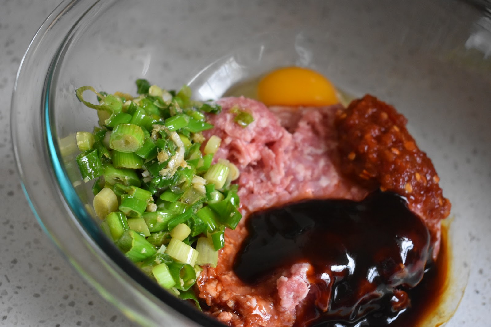 3. In a large mixing bowl, combine the pork, chili garlic sauce, hoisin sauce, soy sauce, egg and cooked garlic, ginger and green onion.
