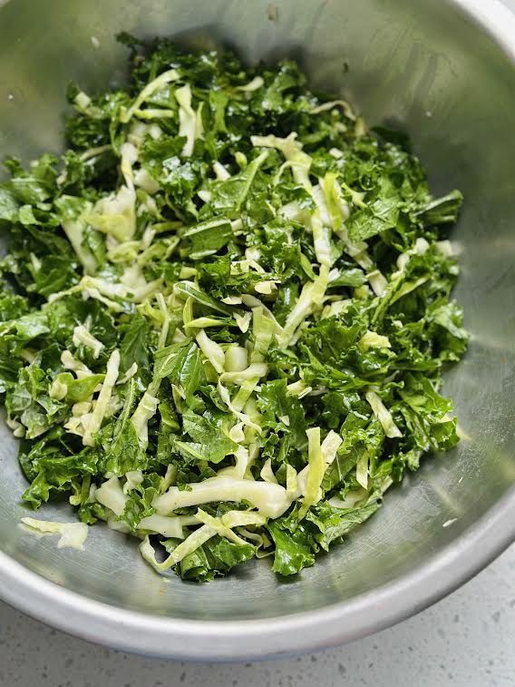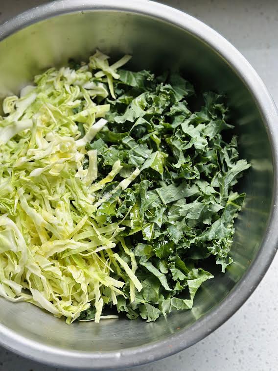 1. Place thinly sliced kale and green cabbage in a large bowl. Drizzle with 1 tablespoon of olive oil and a small pinch of salt. Use your (clean!) hands to massage the greens for 1-2 minutes, until the kale is tender and slightly wilted and the cabbage softens just a bit.
