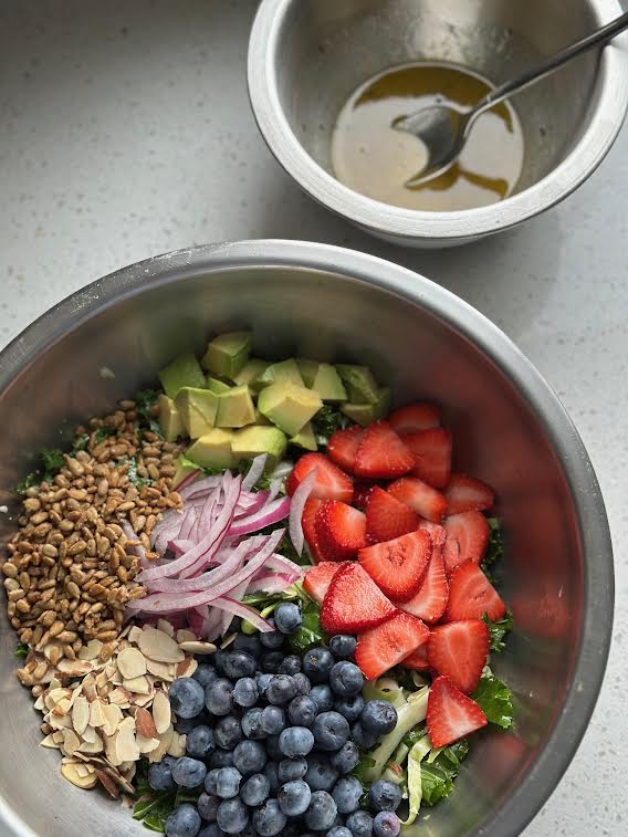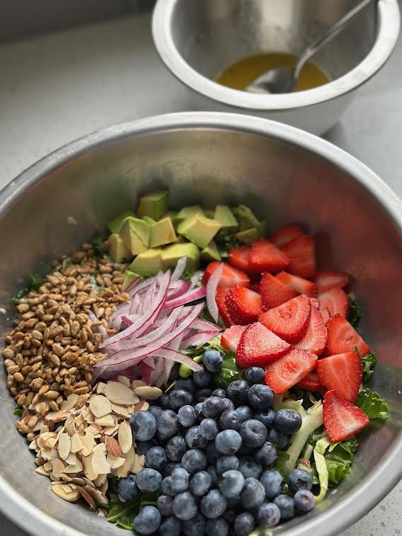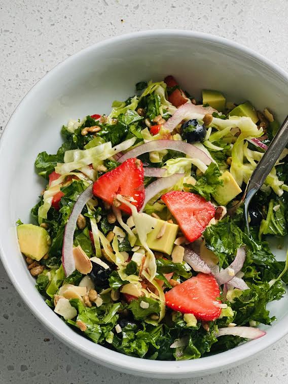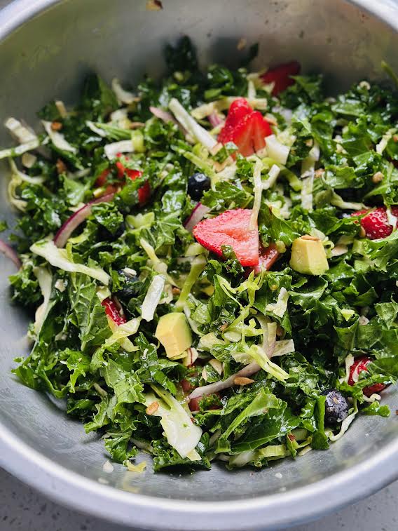3. Add strawberries, blueberries, avocado, red onion, sunflower kernels and toasted almonds to the massaged greens. Drizzle with dressing and toss gently to coat.