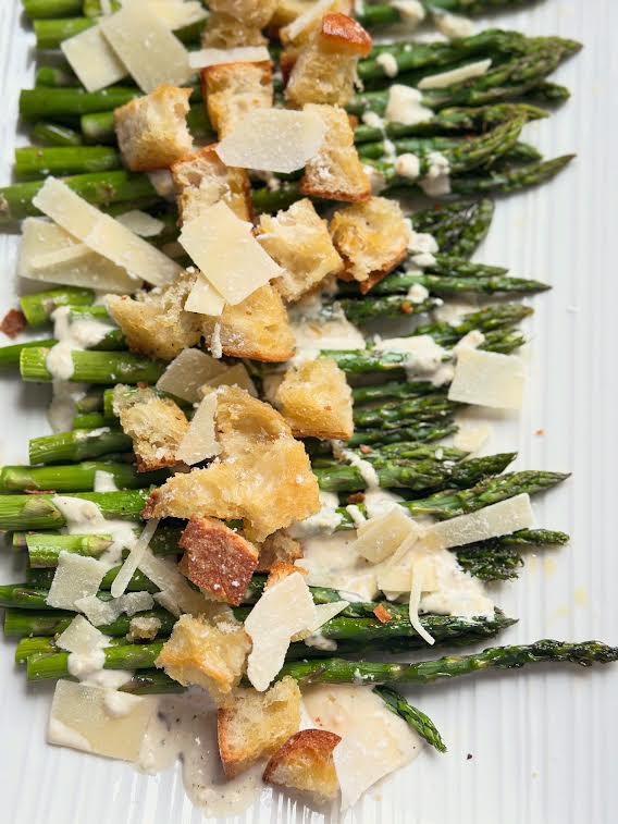 Spring is here and that means asparagus season is so soon! This recipe has quickly become one of my favorite ways to prepare the spring veggie. The lemony Caesar dressing, nutty parmesan cheese and toasty croutons add layers of flavor and texture to this dish. Serve on it’s own or as a side dish for Caesar Asparagus with Crispy Croutons