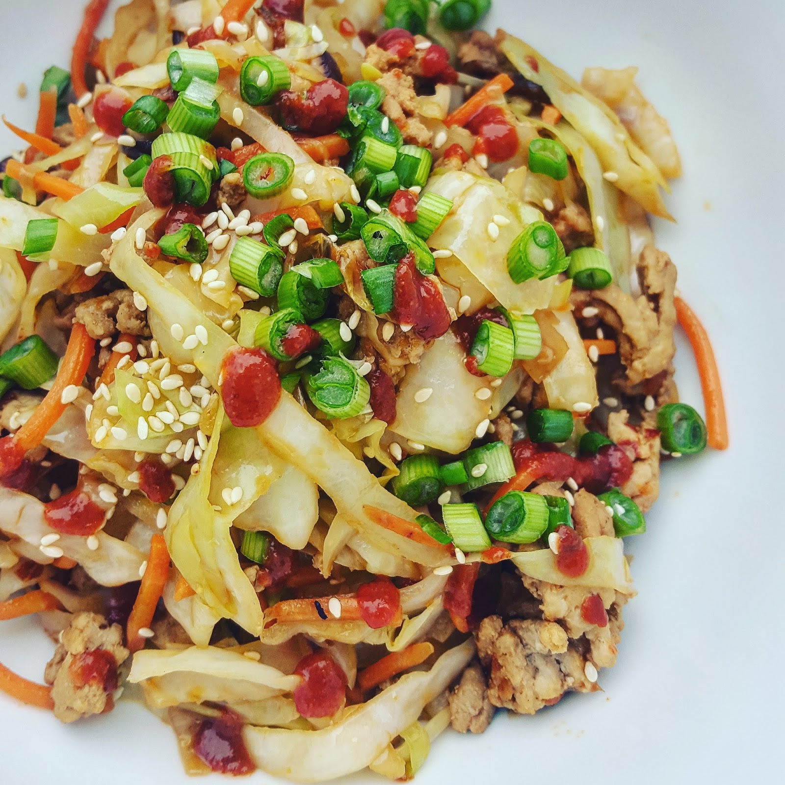 3. Add the cabbage and carrots and cook for 5 minutes longer, or until the cabbage has softened slightly. Add the cooked chicken back to the pan and finish with chili garlic sauce and sesame oil.