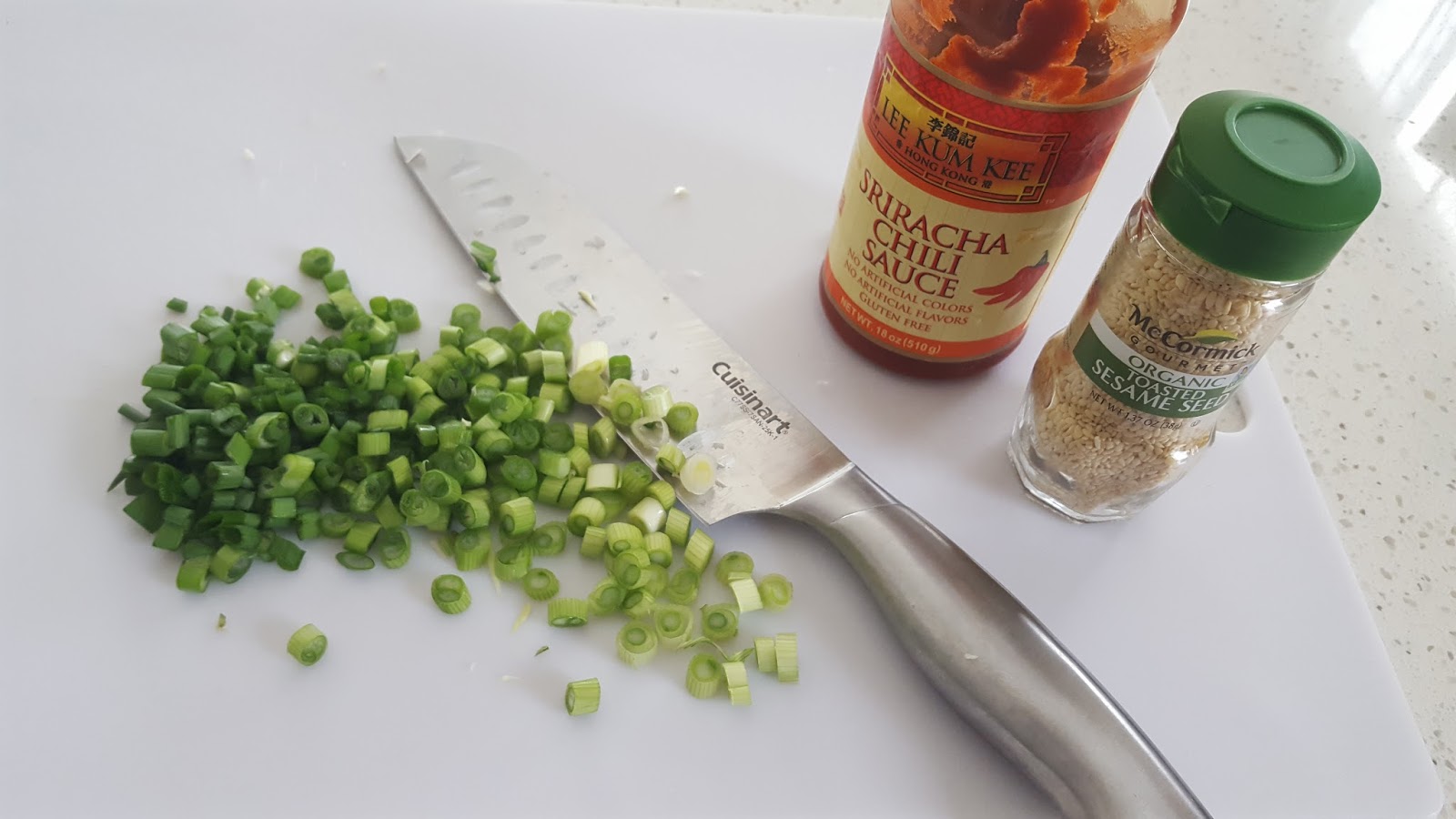 Sriracha, sliced green onion and toasted sesame seeds, for garnish