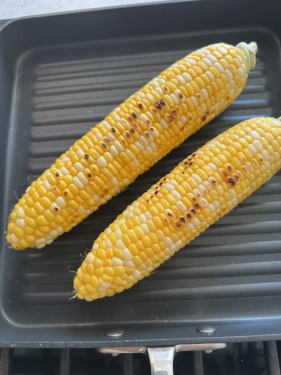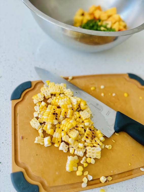 1. Grill corn over medium heat until lightly charred, about 10 minutes, turning occasionally. Let cool, then slice kernels off the cob. (Alternatively, you can boil or steam the corn instead.)