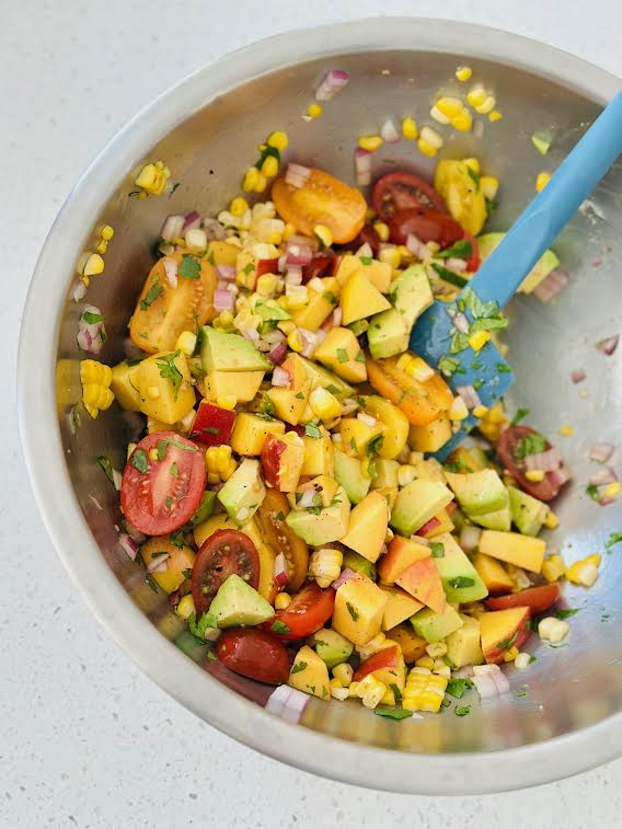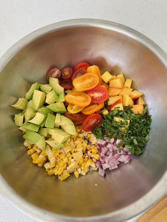 2. Place corn kernels, peaches, avocado, tomatoes, red onion and cilantro in a large bowl.