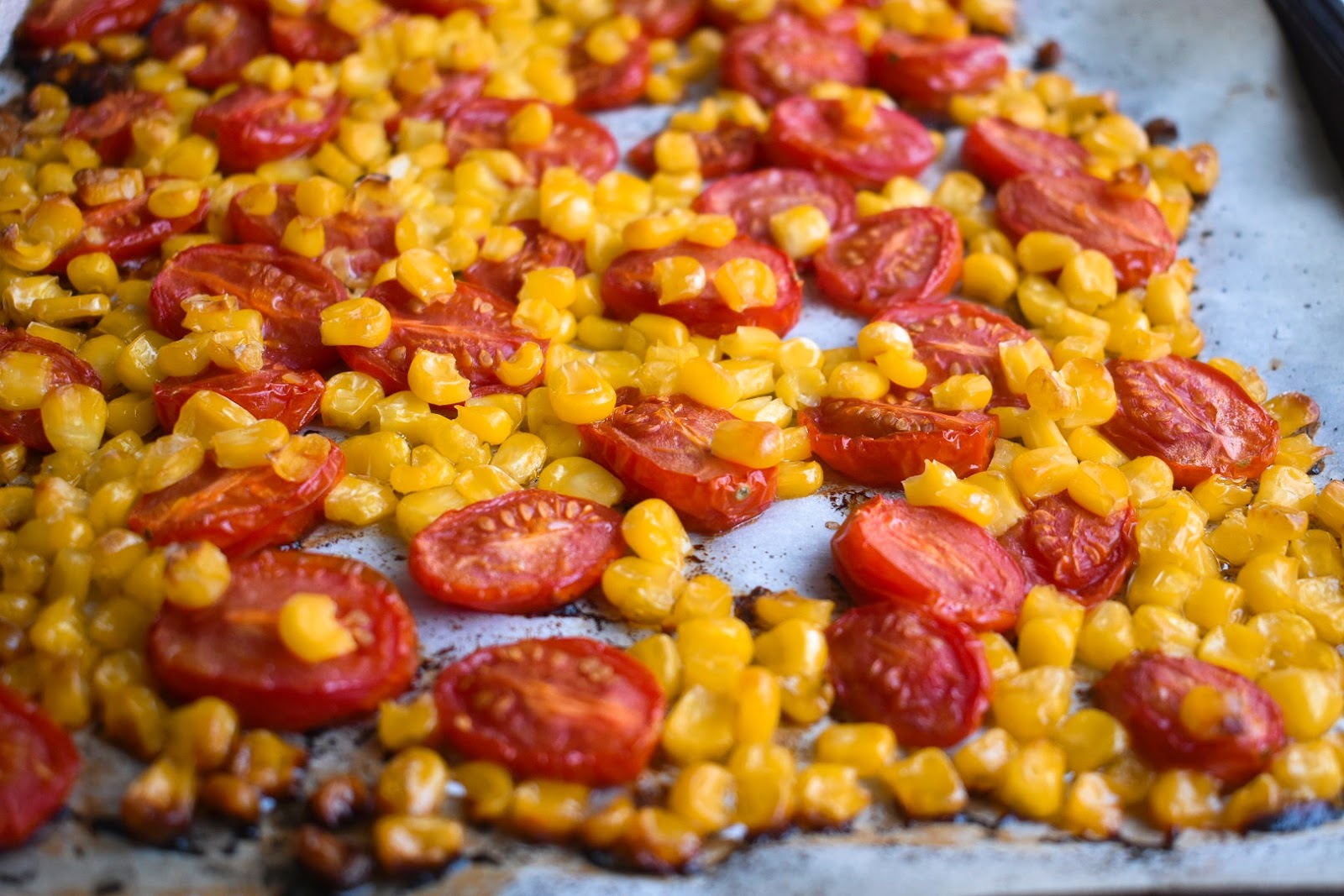1. Preheat oven to 425. Line a baking sheet with parchment paper. Place corn and tomatoes on top and drizzle with olive oil. Season with salt and roast for 25 minutes.