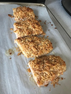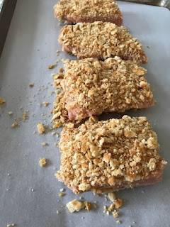 2. Place milk and beaten eggs in a bowl. Place crushed crackers on a plate. Soak each salmon filet in the milk/egg mixture, then coat with cracker crumbs. Place on the prepared baking sheet and drizzle with melted butter. Roast for 10 minutes, or until the salmon flakes easily with a fork.