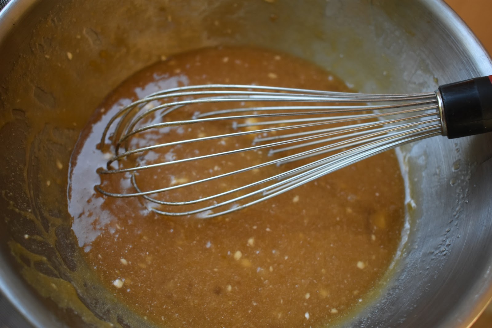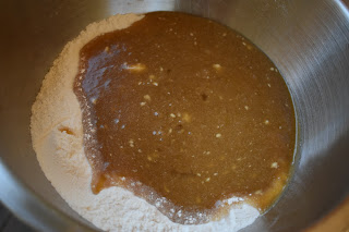 3. Whisk the butter, brown sugar, eggs and vanilla together in a separate bowl. Add to the dry ingredients and stir to combine.
