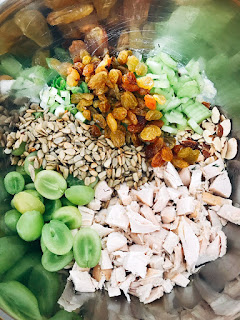 2. Add chicken, grapes, almonds, celery, green onion, raisins and sunflower seeds and stir to combine.