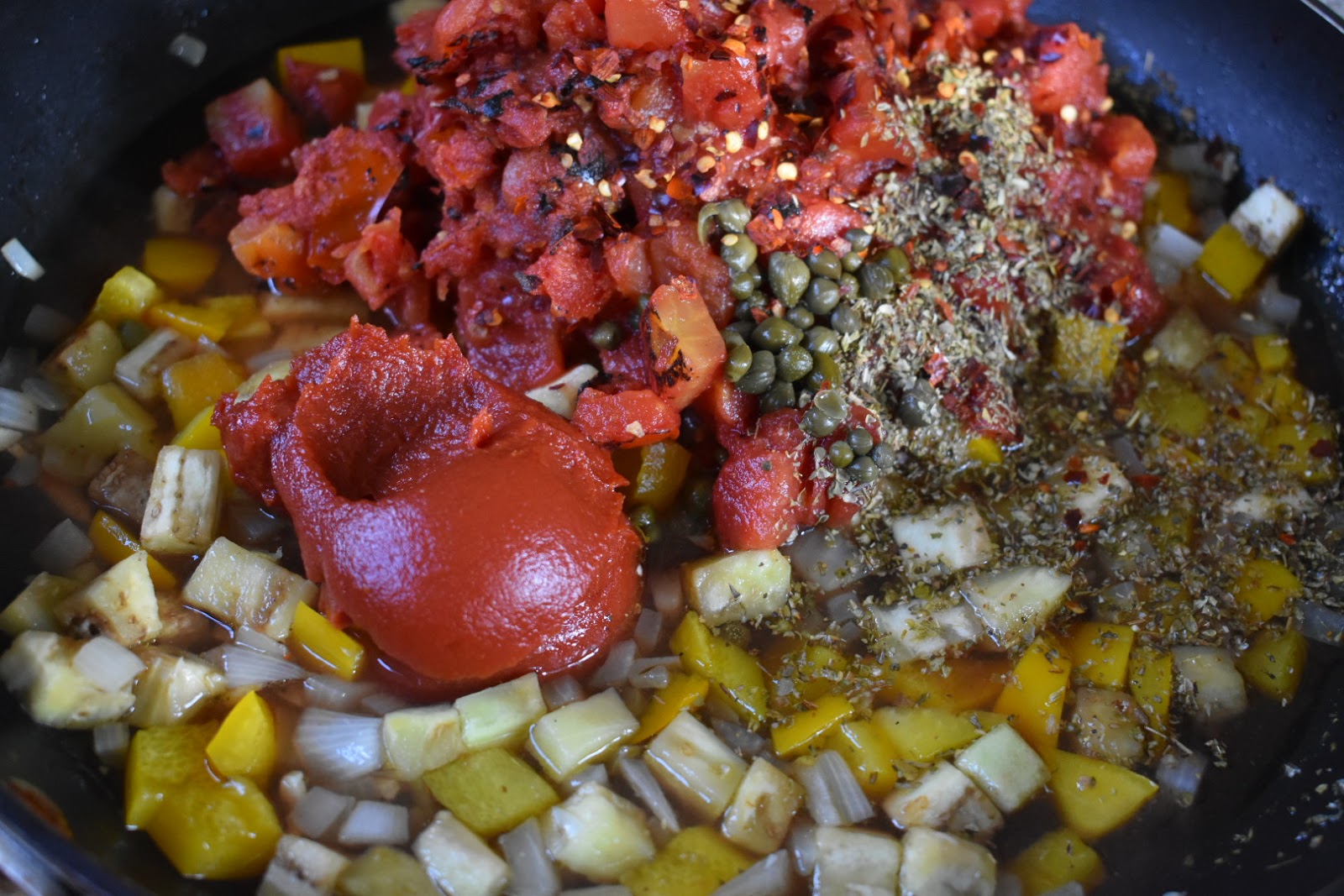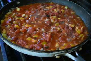3. Add tomato paste, canned tomatoes, vinegar, agave, Italian seasoning, capers and crushed red pepper. Bring to a simmer and cook for 10 minutes.