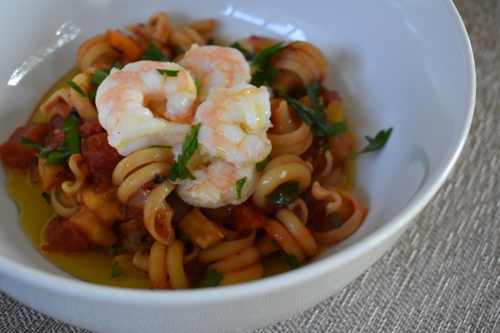 5. Finish the sauce with parsley; season with salt and pepper, to taste. Add the cooked pasta and toss gently to combine. Scoop pasta into serving bowls and top with shrimp. Garnish with parsley and a drizzle of olive oil and serve.