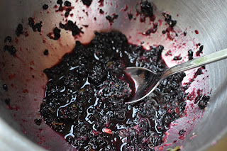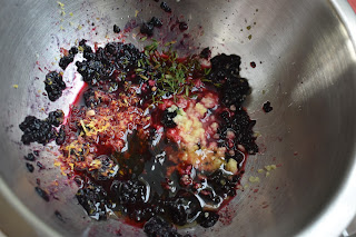 2. Meanwhile, place blackberries in a mixing bowl and mash lightly with a potato masher. Add lemon zest/juice, honey, ginger and thyme and stir to combine.