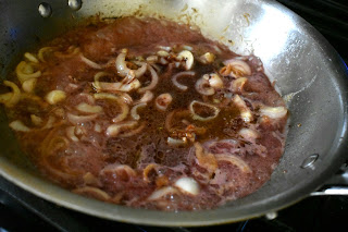 3. Once out of the oven, transfer the chicken to a platter to rest and tent with foil. Add the remaining tablespoon of oil plus 2 tablespoons butter to the skillet. Saute shallots in the butter for 3 minutes, or until lightly softened. Deglaze the pan with red wine and reduce by half.