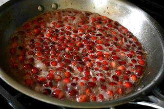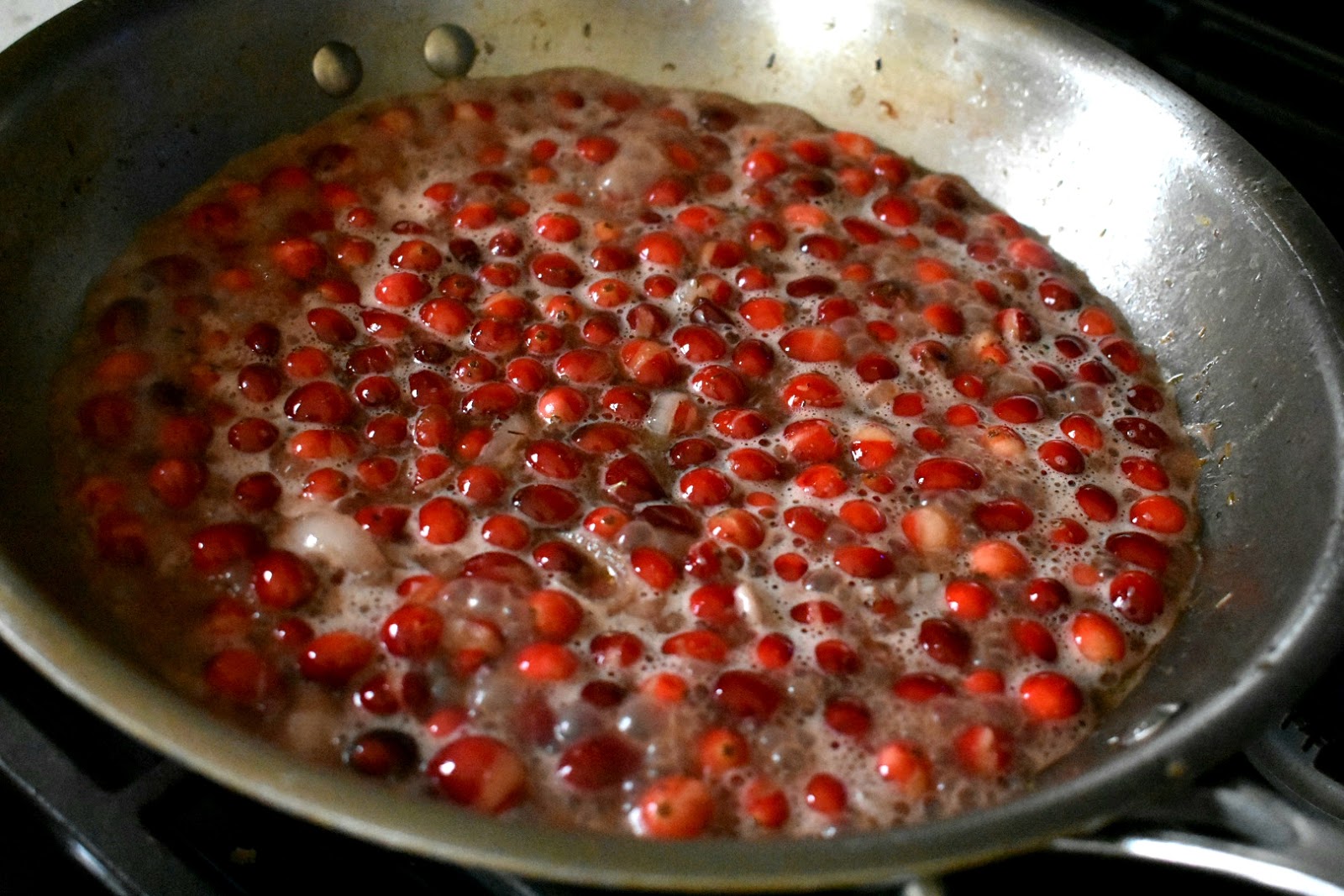 4. Add the thyme, chicken stock and cranberries to the pan and cook until the cranberries break down slightly, about 5-7 minutes. Finish the sauce with orange zest/juice and agave.