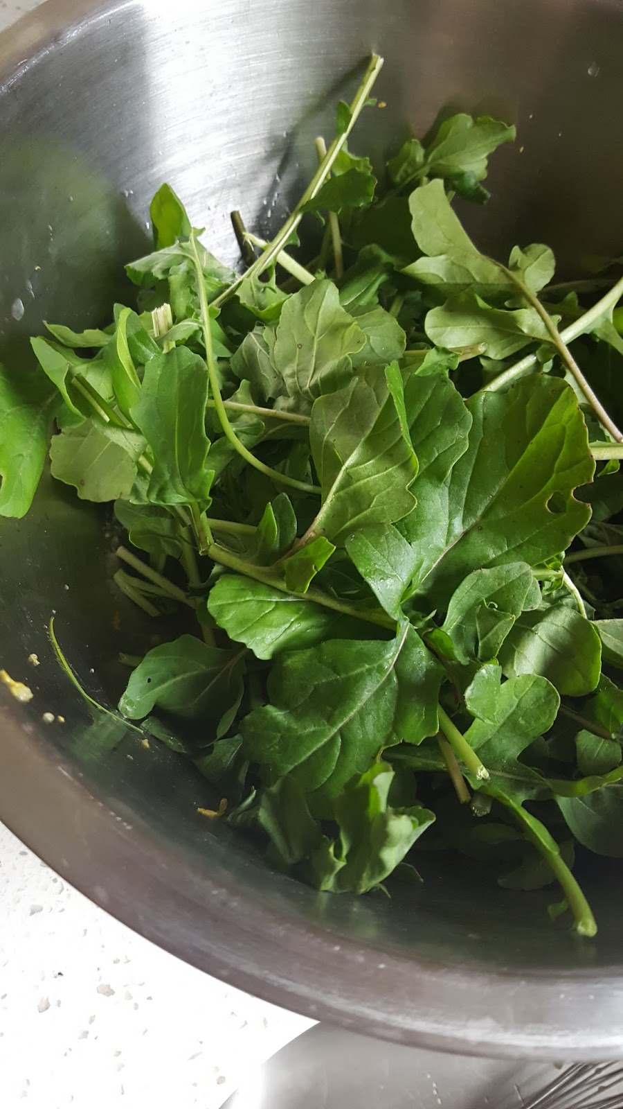 4. Bake for 18 minutes, or until set. Meanwhile, combine the lemon zest/juice, honey, Dijon, salt and pepper in a large bowl. Add the arugula and lightly toss to combine.