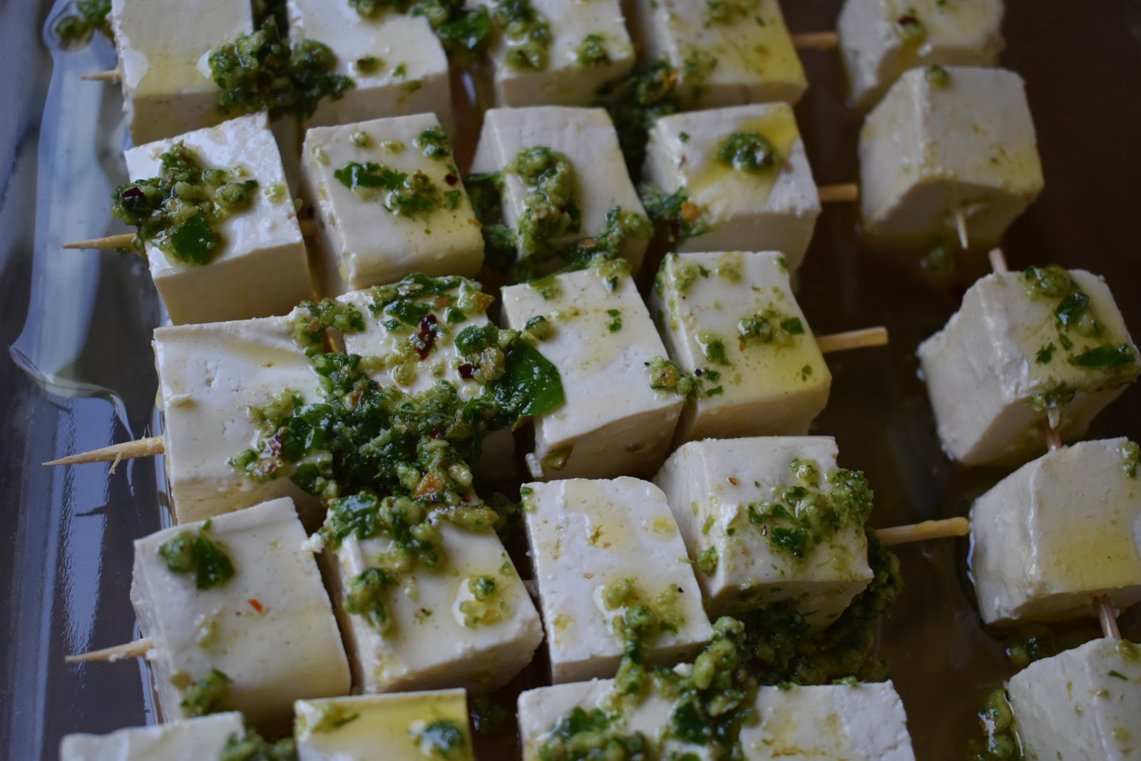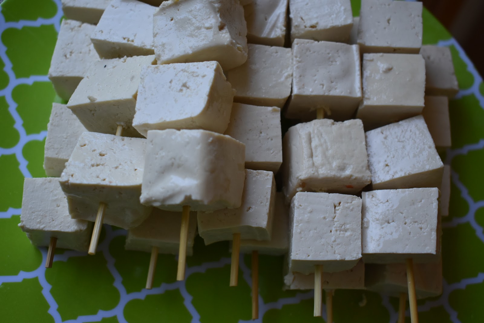 2. Cut the tofu into large chunks and place 4-5 pieces onto each skewer.