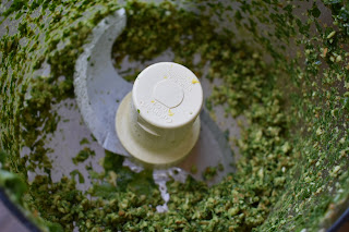 3. Place the almonds, garlic, basil, parsley and lemon zest/juice in a food processor and pulse until finely ground. Transfer to a mixing bowl and stir in olive oil. Season with salt, pepper and crushed red pepper flakes.