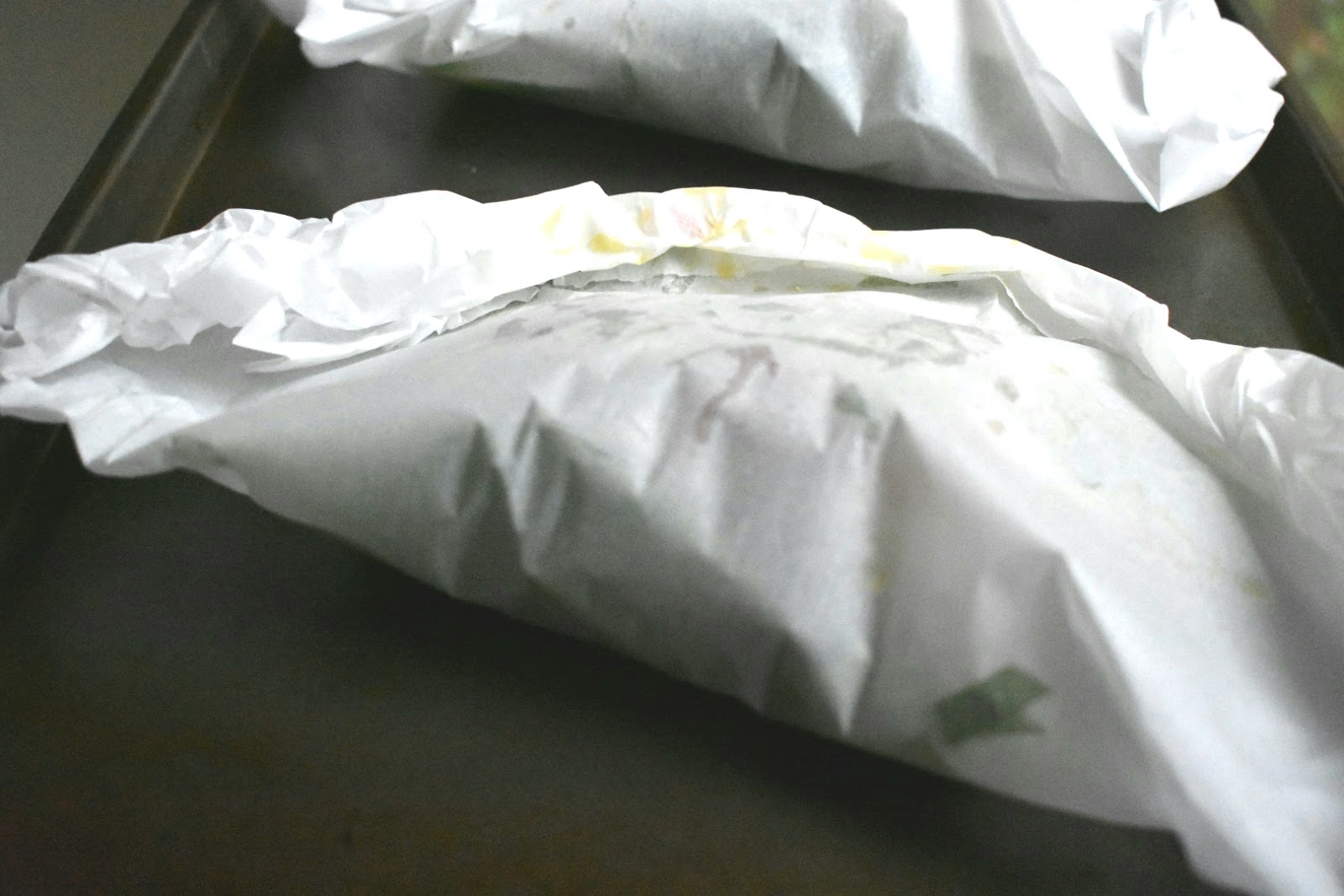 4. Place the parchment packets on a baking sheet and bake for 20 minutes.