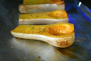 1. Preheat oven to 400. Line a baking sheet with foil and place the squash halves on top. Drizzle with olive oil, season with salt and pepper and roast for 40 minutes, or until tender.