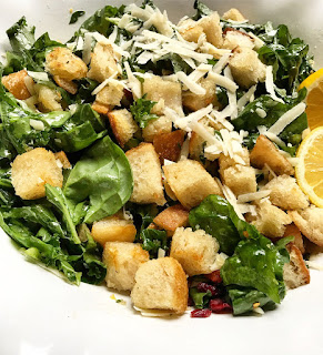 4. Add the warm bread, parmesan and dried cranberries to the kale/spinach mixture and toss gently to combine. Serve immediately.