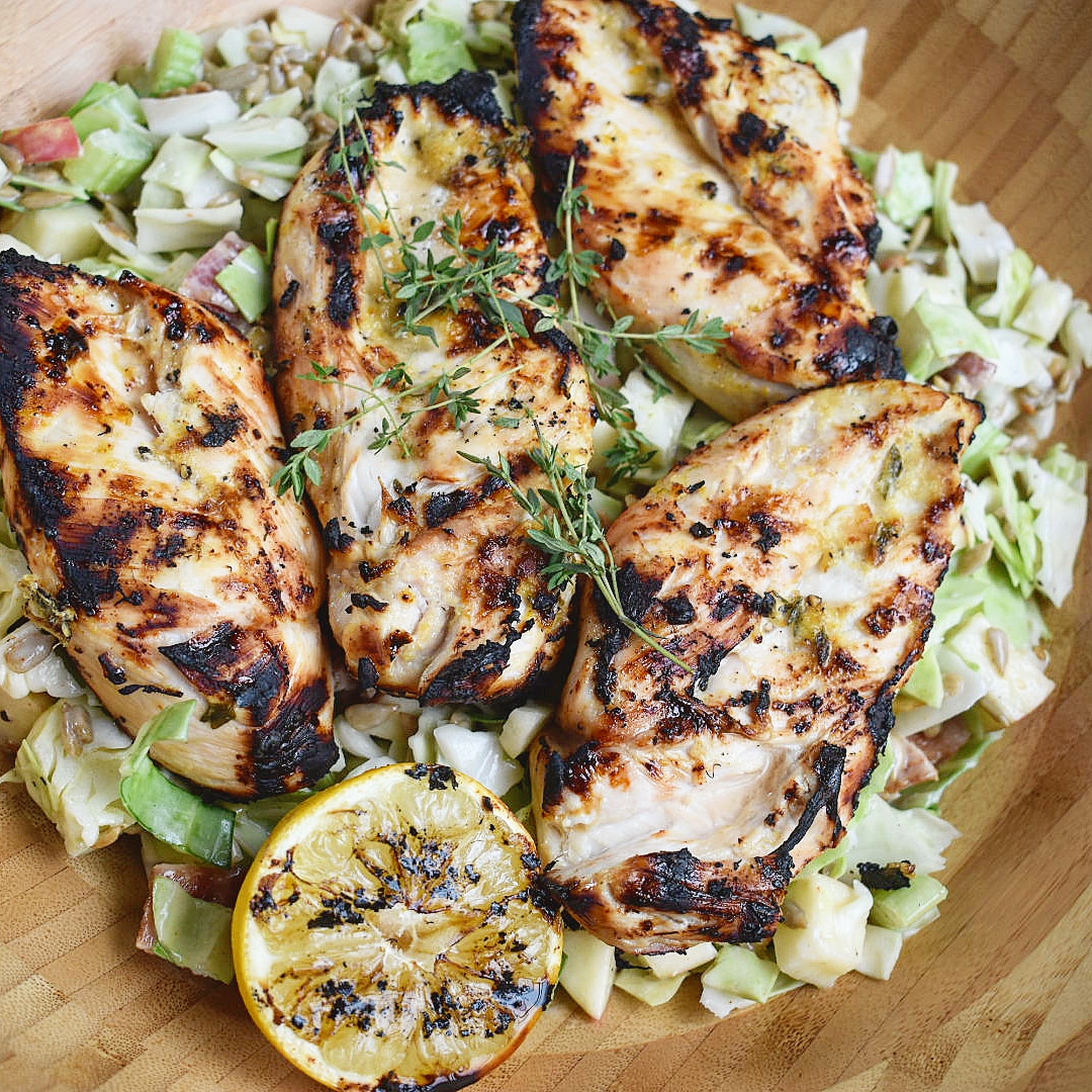 Lemon-Thyme Grilled Chicken with Apple, Bacon and Celery Slaw