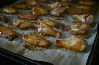 1. Preheat oven to 425. Line a large baking sheet with parchment paper and lay chicken wings on the sheet in a single layer, skin side down. Bake for 20 minutes, flip and bake for 15 minutes longer.