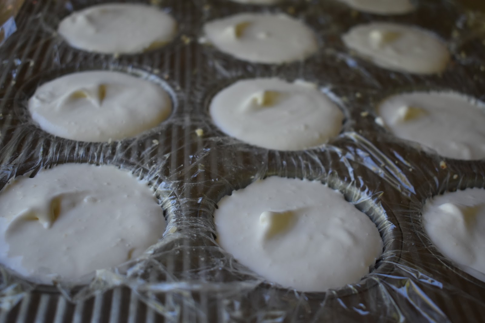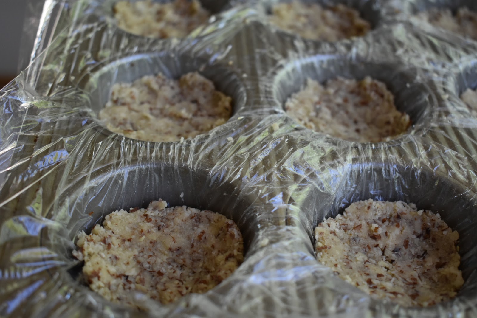 1. Line a muffin tin with plastic wrap. Combine the crust ingredients in a small bowl and divide evenly among the muffin tins. Place in the freezer to set.