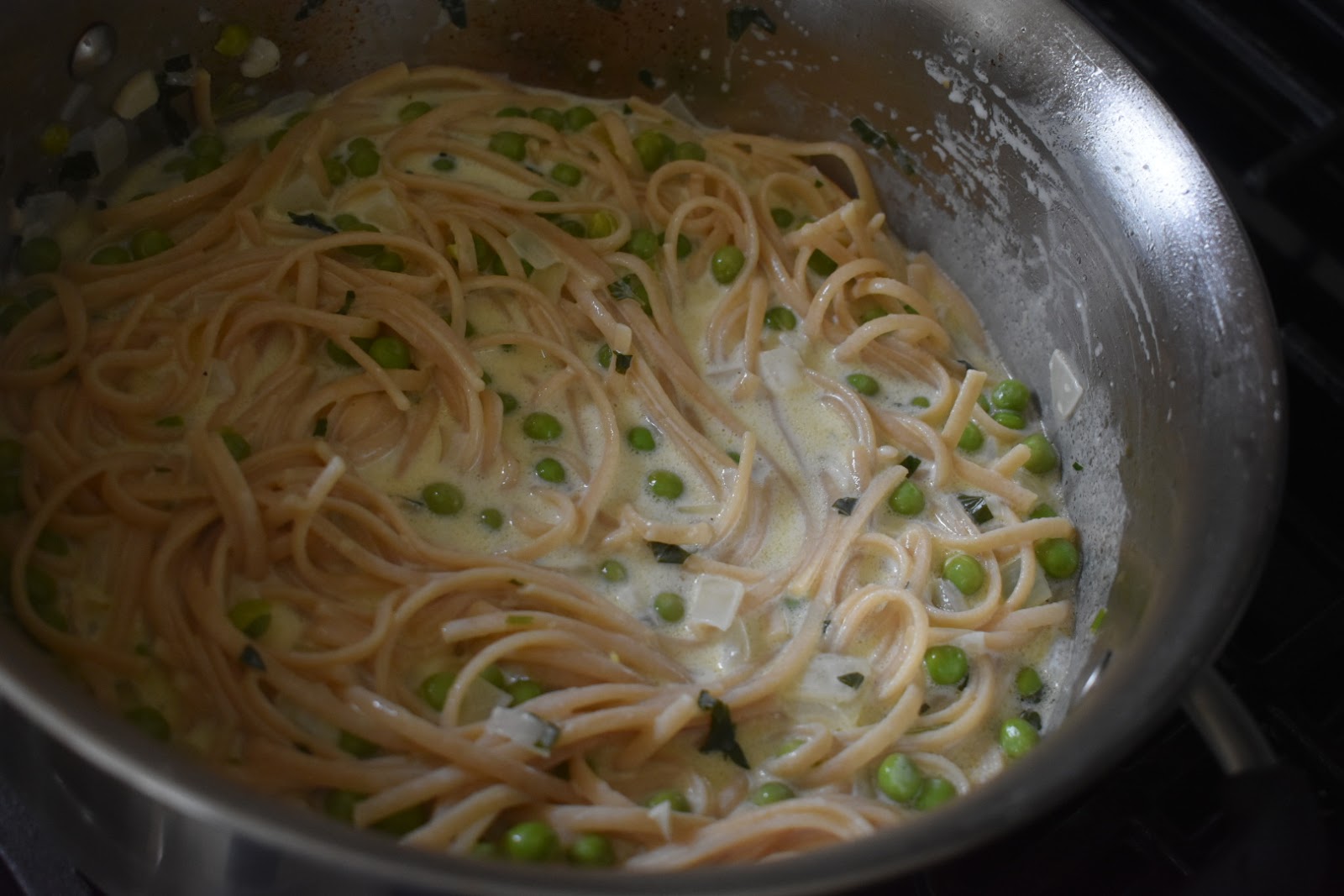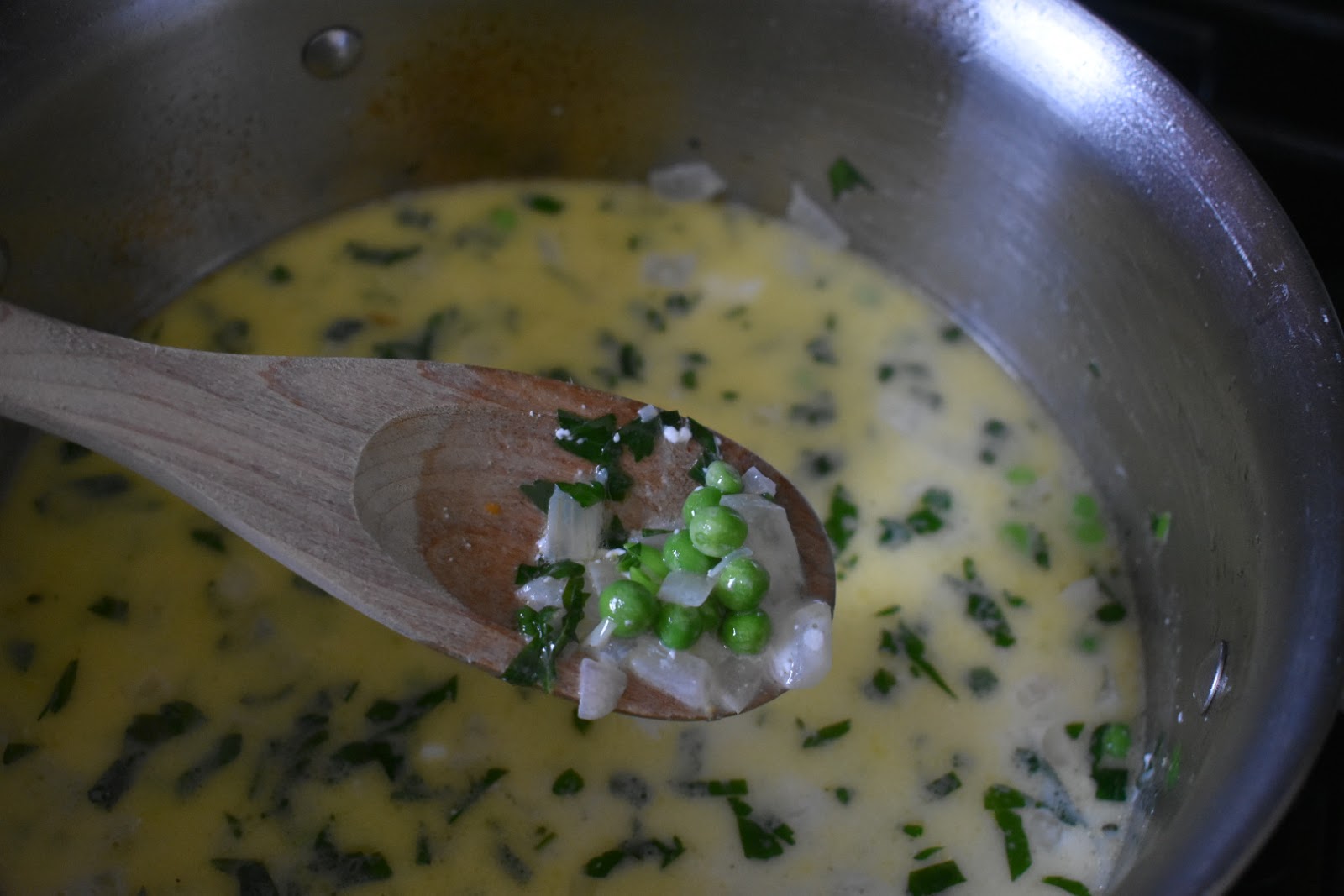 Finish with peas and remove pan from heat.