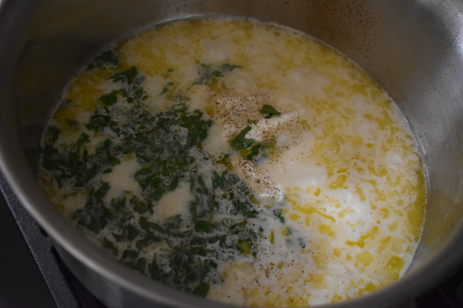 Add chicken broth and bring to a simmer. Whisk in cream, cream cheese,