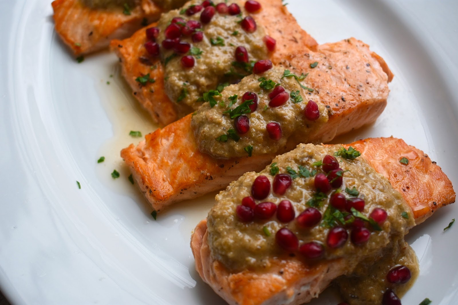 Pan-Seared Salmon with Walnut-Olive Pesto and Pomegranate