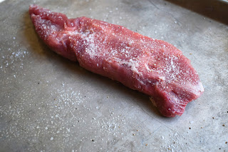 1. Preheat oven to 400. Coat a baking sheet with cooking spray and place pork tenderloin on top. Season the pork with salt and pepper and bake for 15 minutes, flipping halfway through roasting.