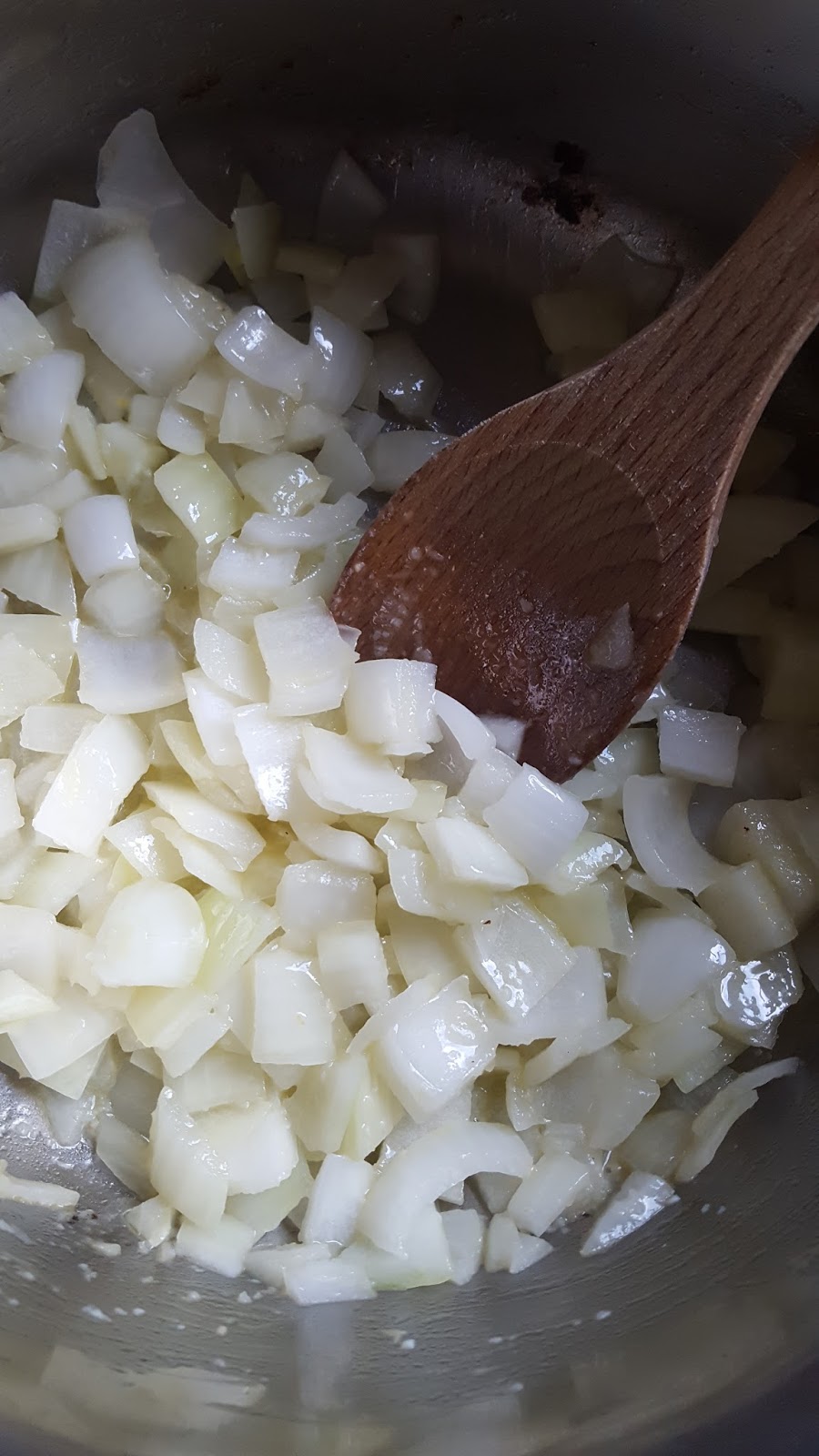 2. While the pumpkin cools, heat butter and olive oil in a large saucepan over medium heat. Add onion and garlic and cook for 2 minutes. Season with salt and pepper (to taste) and add the remaining spices.