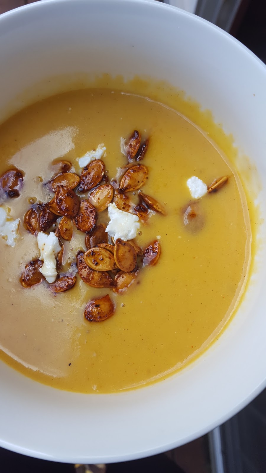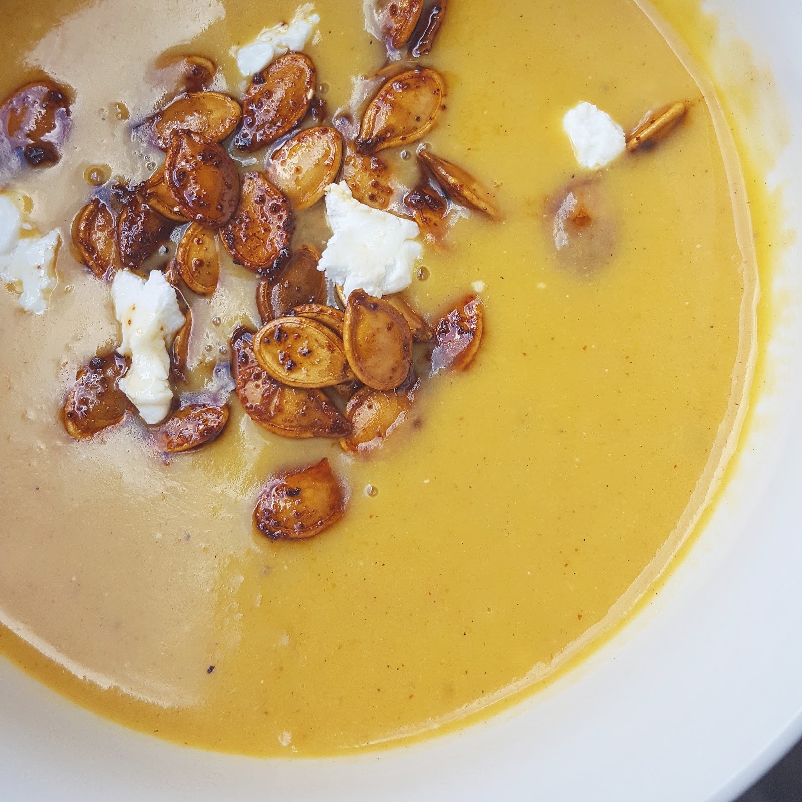 6. Adjust the seasonings as needed, then ladle the soup into bowls and garnish with pumpkin seeds and crumbled goat cheese.