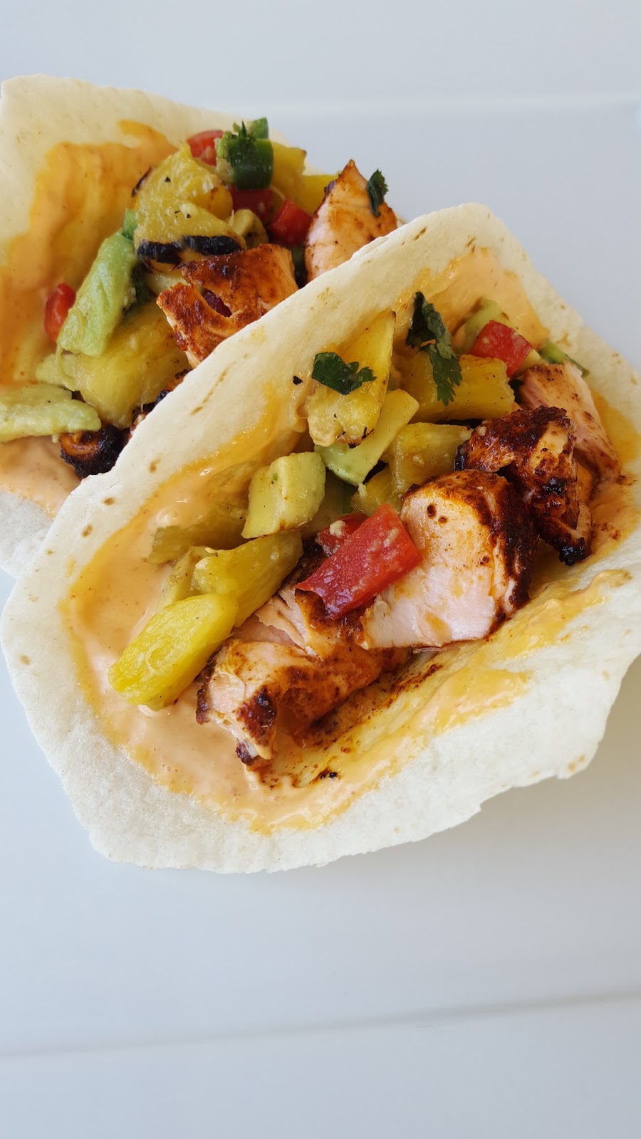 Salmon Tacos with Spicy Mayo and Grilled Pineapple Salsa