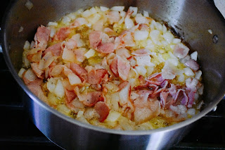 1. Melt the olive oil and butter in a large saucepan over medium heat. Add bacon and onions and cook, stirring occasionally, until the bacon fat has rendered and the onions are softened, about 8 minutes. Season with salt and pepper.