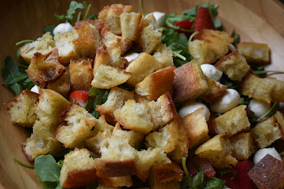 2. Place arugula in a large salad bowl and top with strawberries, basil, mozzarella and the toasty bread cubes.