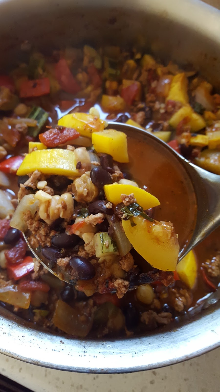 3. Add the cooked turkey back to the pot, followed by the chicken stock, tomatoes, spices and beans. Bring to a simmer, cover and reduce heat to low. Cook for 30 minutes, stirring occasionally.