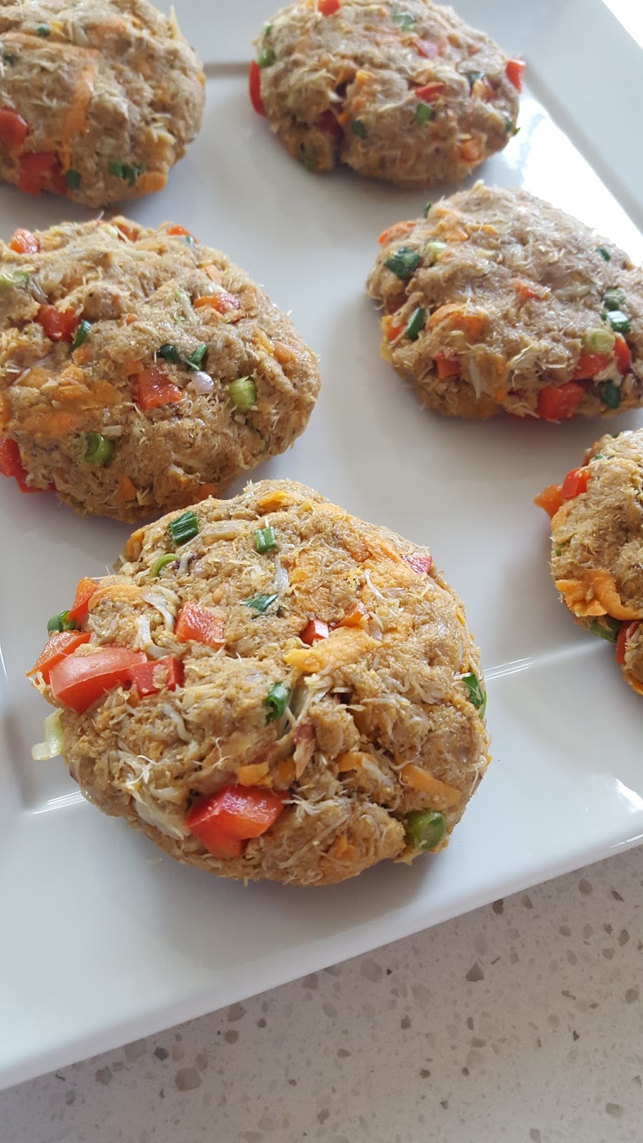 (Veggie-Loaded) Crab Cakes with Dill Yogurt Sauce