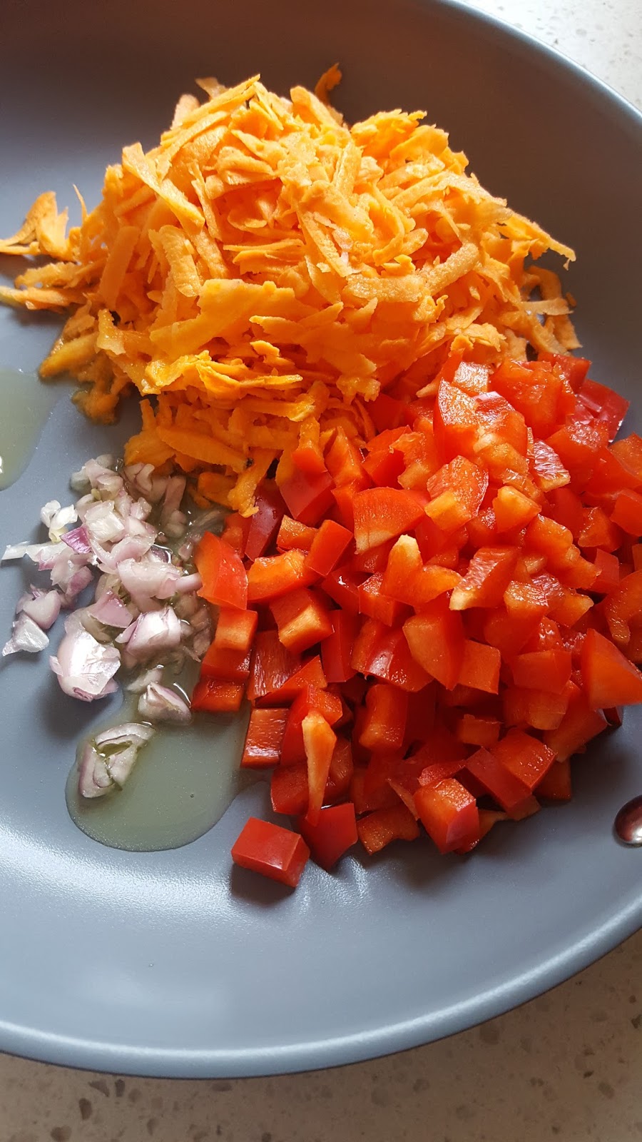 2. Heat 1 tablespoon olive oil in a large skillet over medium heat. Add shallot, sweet potato and red pepper and cook for 2 minutes, stirring often. Remove from heat and allow to cool slightly.